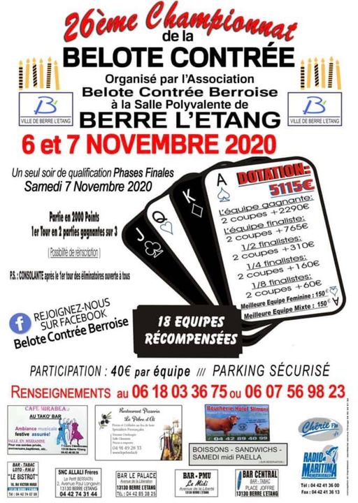 Tournoi de belote contrée - Berre l'Etang - 6 et 7 novembre 2020